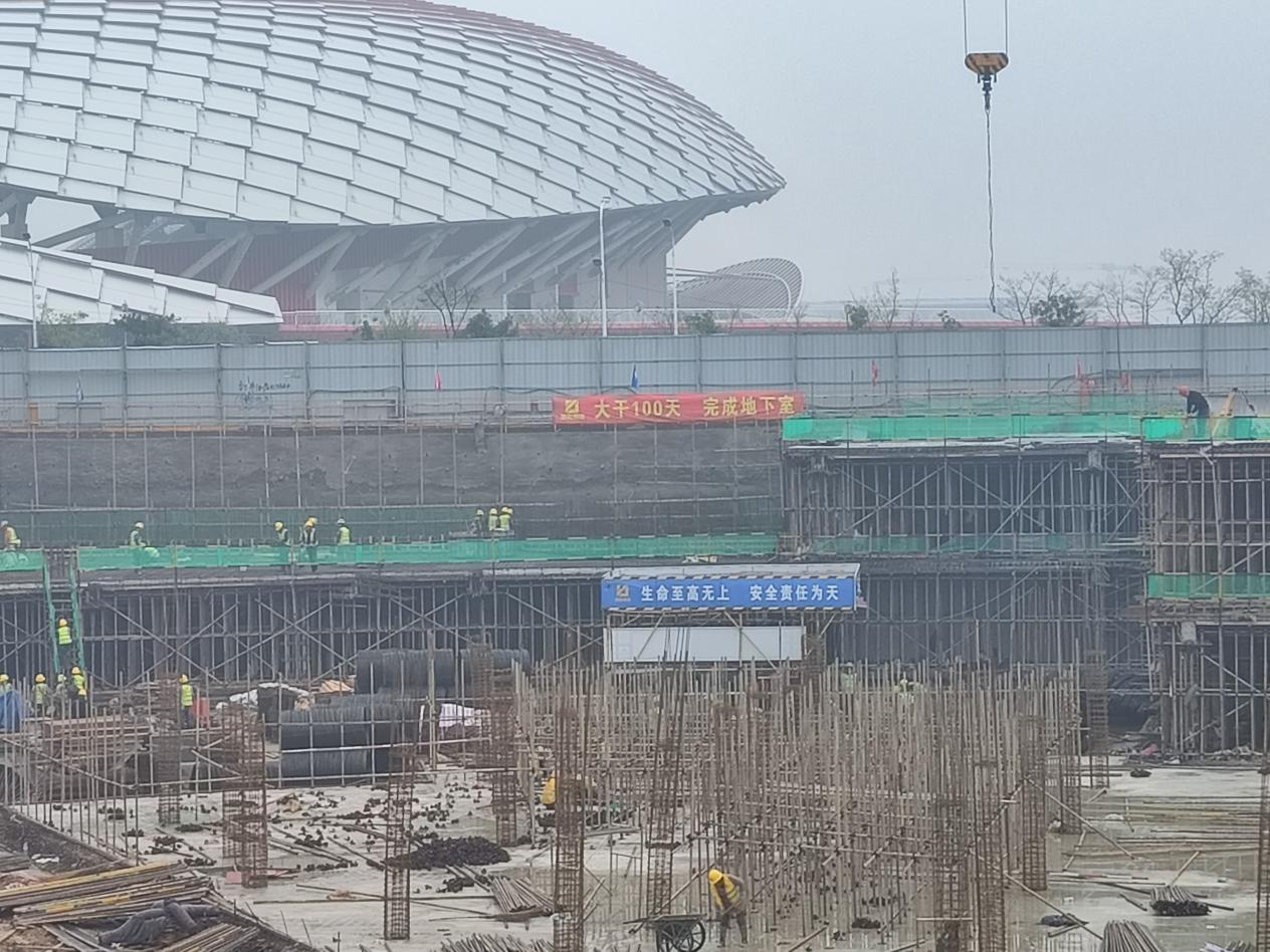 該項目年前因環(huán)保督查、大氣污染治理、雨雪天氣和馬拉松活動影響等原因,導致施工現(xiàn)場多次停工,土方外運困難,造成工程進度嚴重滯后。年后,城開集團組織召開3月份復工復產(chǎn)工作會議,為了把耽誤的時間搶回來,要求掀起大干高潮——“大干一百天,完成地下室”,營造大干的氛圍。