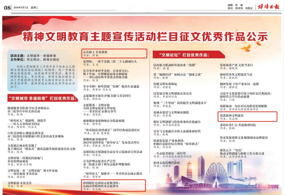 5月7日,由市文明辦、蚌埠日報(bào)社聯(lián)合主辦的精神文明教育主題宣傳征文活動(dòng)結(jié)果揭曉,蚌固路公司職工劉志剛的征文作品《淺談精神文明建設(shè)》、王義鵬的征文作品《蚌固路紅色驛站志愿服務(wù)隊(duì):弘揚(yáng)雷鋒精神傳承志愿薪火》和路橋公司職工周敏的征文作品《心在路上 不負(fù)夢想》獲評優(yōu)秀作品。