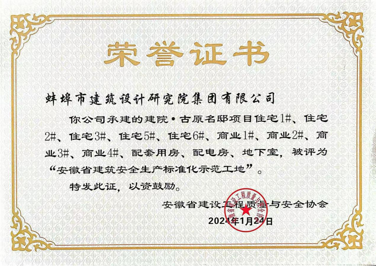 近日,建院集團(tuán)運(yùn)營(yíng)管理的古原名邸項(xiàng)目、靜湖灣Epc項(xiàng)目和聆湖灣東苑Epc項(xiàng)目榮獲“安徽省建筑安全生產(chǎn)標(biāo)準(zhǔn)化示范工地”稱號(hào)。