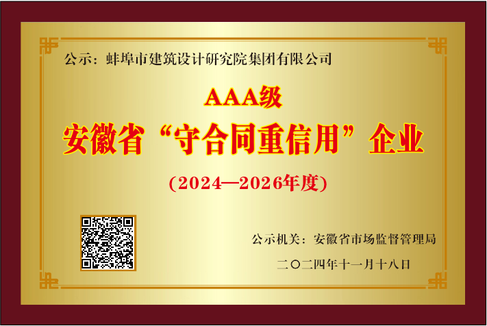 2024年11月18日,蚌埠市建筑設(shè)計研究院集團(tuán)有限公司榮獲安徽省AAA級“守合同重信用”企業(yè)稱號。