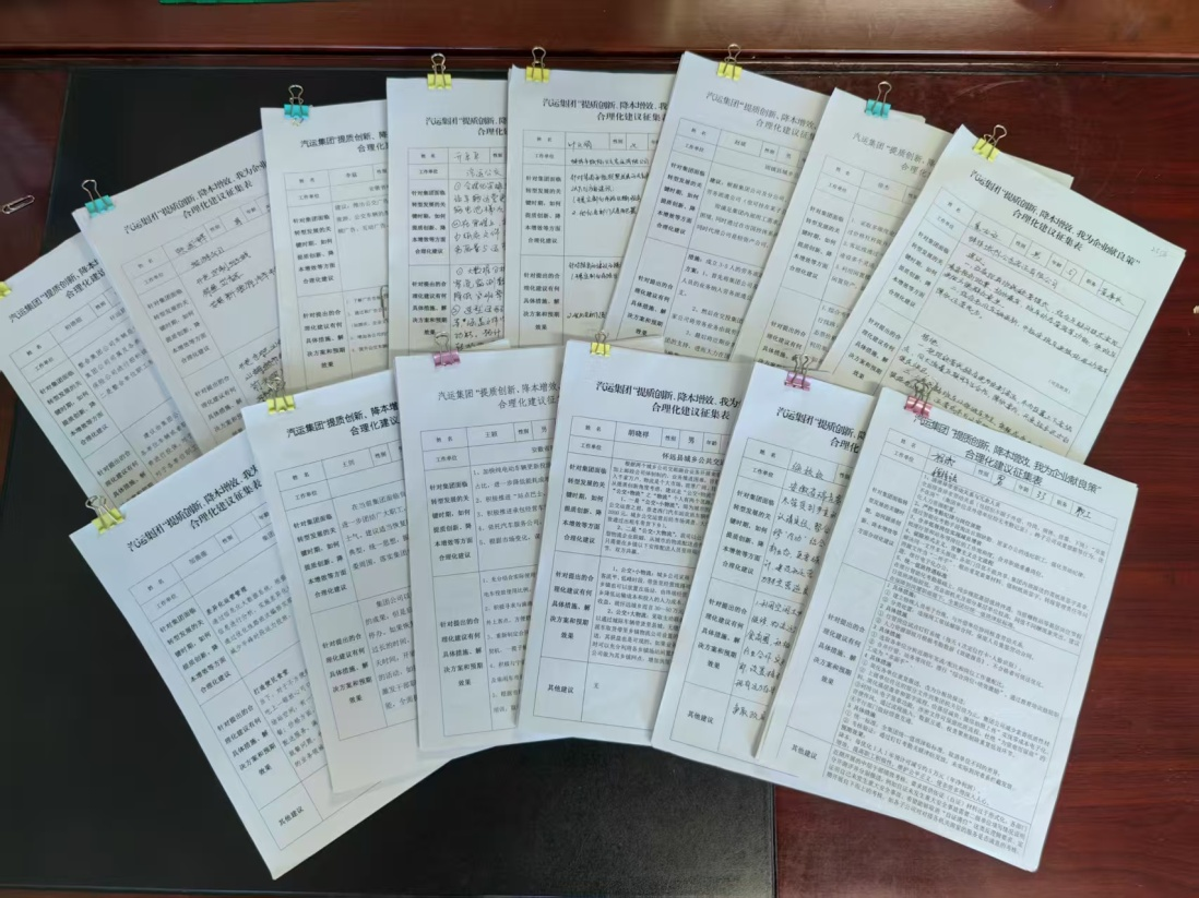 廣大職工積極響應、踴躍參與,中層以上干部帶頭提交建議,充分發(fā)揮示范引領(lǐng)作用。本次活動共征集建議410條,經(jīng)過評審組兩輪篩選,最終評選出具有較高參考價值的有效建議30條,內(nèi)容主要涵蓋降本增效、信息化建設、轉(zhuǎn)型創(chuàng)新、安全管理、高質(zhì)量發(fā)展等多個方面,不僅增強了廣大干部職工的企業(yè)歸屬感和認同感,同時也充分體現(xiàn)了職工的主人翁意識和集體智慧,為汽運集團突破現(xiàn)階段發(fā)展瓶頸、加速轉(zhuǎn)型步伐提供了可借鑒、可落地的創(chuàng)新思路和解決方案。